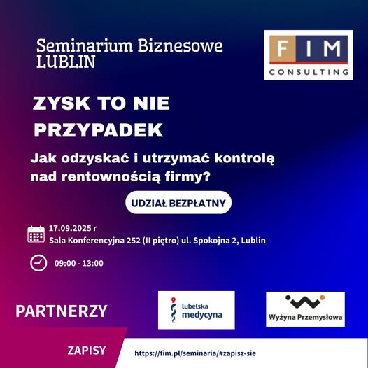 Jako Klaster Lubelska Medycyna, wspólnie z Klastrem Wyżyna Przemysłowa i FIM Consulting, zapraszamy na bezpłatne seminarium „Zysk to nie przypadek. Jak odzyskać i utrzymać kontrolę nad rentownością firmy?”. To wydarzenie dla wszystkich*, którzy chcą systemowo podejść do zarządzania finansami.