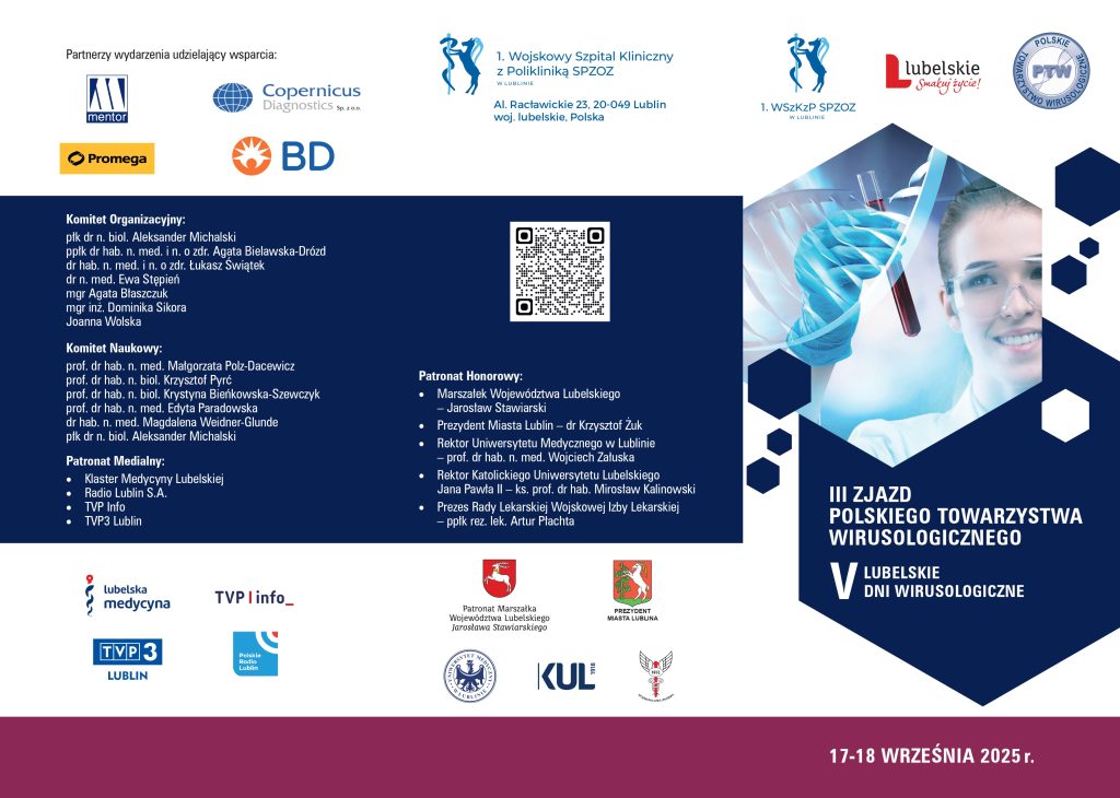 Już w dniach 17-18 września 2025 r. 1 Wojskowy Szpital Kliniczny z Polikliniką SPZOZ w Lublinie zamieni się w miejsce rozmów i prelekcji przedstawicieli wiodących instytucji naukowych z Polski i zagranicy na tematy związane z wirusologią. A my jako Klaster Lubelska Medycyna mamy zaszczyt być patronem tego wydarzenia. III Zjazd Polskiego Towarzystwa Wirusologicznego – „𝐕 𝐋𝐮𝐛𝐞𝐥𝐬𝐤𝐢𝐞 𝐃𝐧𝐢 𝐖𝐢𝐫𝐮𝐬𝐨𝐥𝐨𝐠𝐢𝐜𝐳𝐧𝐞” to wydarzenie, które dedykowane jest przedstawicielom świata nauki i medycyny zainteresowanym wirusologią.